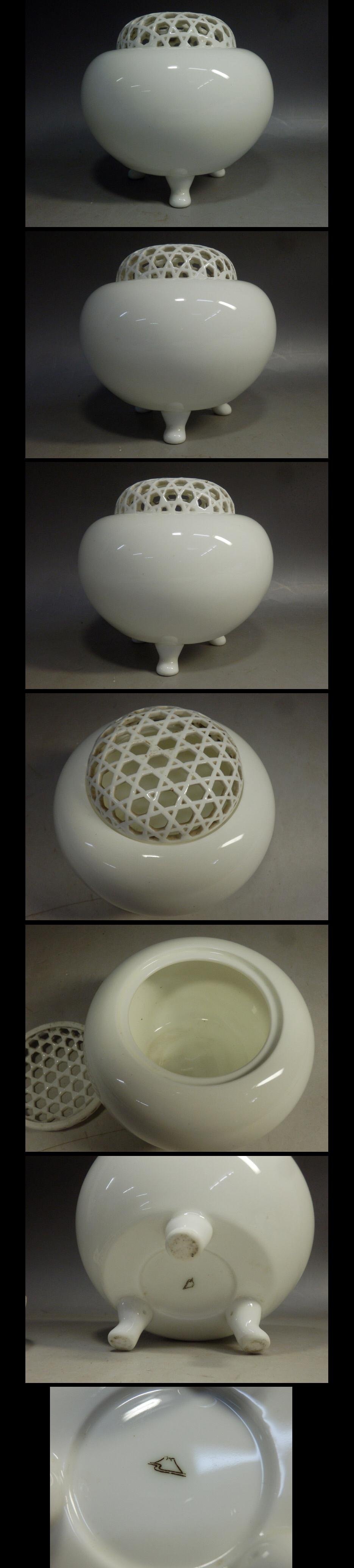 明治期日本皇室御用頂級有田燒 深川白磁 籠目香炉 高:約12cm,